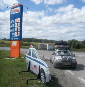 We were back on the road but a long way behind the other teams. We found the right road out of Kiev, it was a nice, smooth, tarmacked motorway......for about 20 miles, then it degenerated into a rough, potholed country lane. Simon wanted to stop for the night, or go back to Kiev, as there were no hotels. "It's fine." I said, we were already a long way behind the others, "You sleep, I'll drive, I feel fine." In truth I was quite tired but kept myself awake by drinking coke and Berocca; if the sugar and vitamins weren't enough to keep me awake then a full bladder was! It was 5am when we crossed the border into Russia and caught up with 4 other teams we'd been travelling with before our breakdown. We spotted their cars in the car park of the first hotel we saw. Then saw that they were asleep in their cars; apparently the hotel was full! We grabbed a few hours sleep then, when the others woke, continued across Russia together.